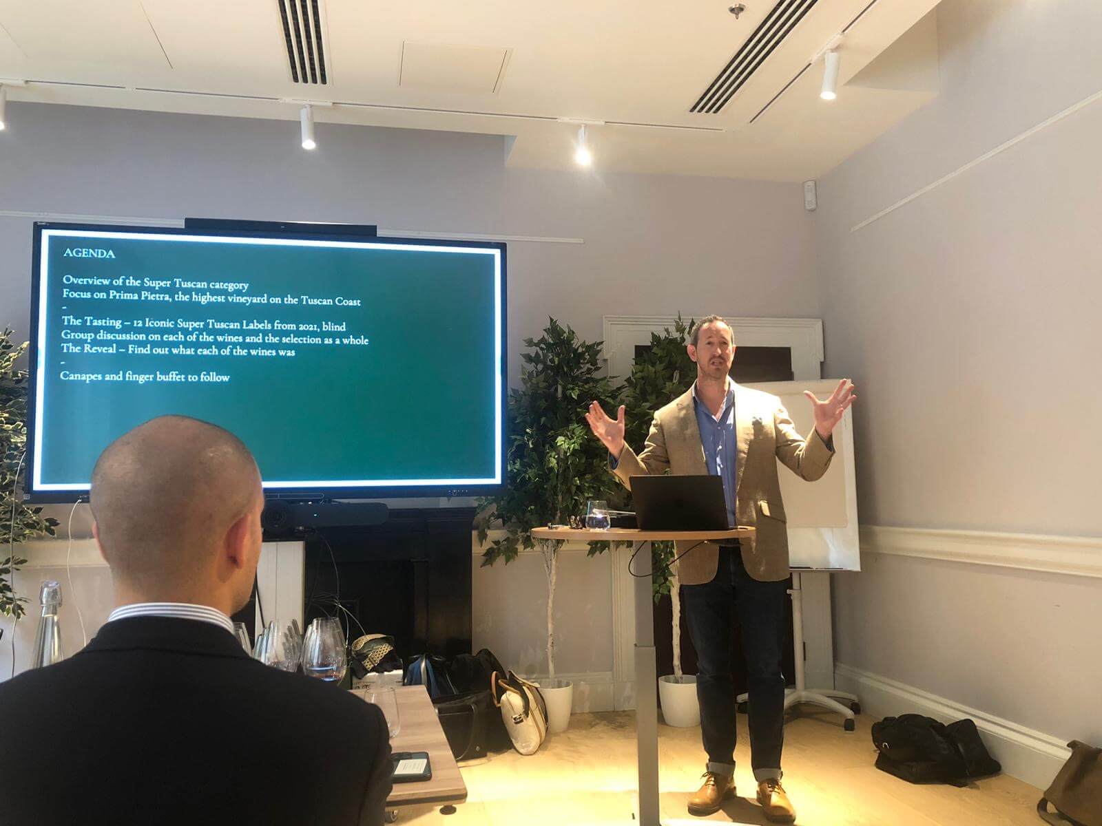 Peter leading the blind tasting of top 2021 Super Tuscans