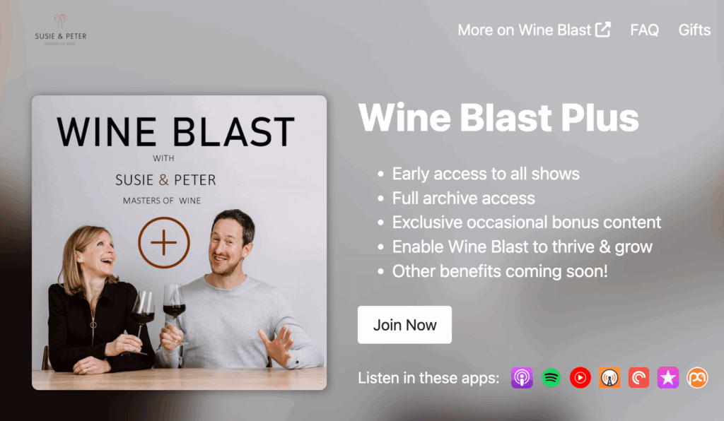 • NB: If you listen in Apple Podcasts, the subscriber-only content won’t show up there if you haven’t yet taken out a subscription. Head over to Wine Blast Plus, sign up, and all your wonderful subscriber benefits, from Early Access to Archive Access and Bonus Content, will magically appear.