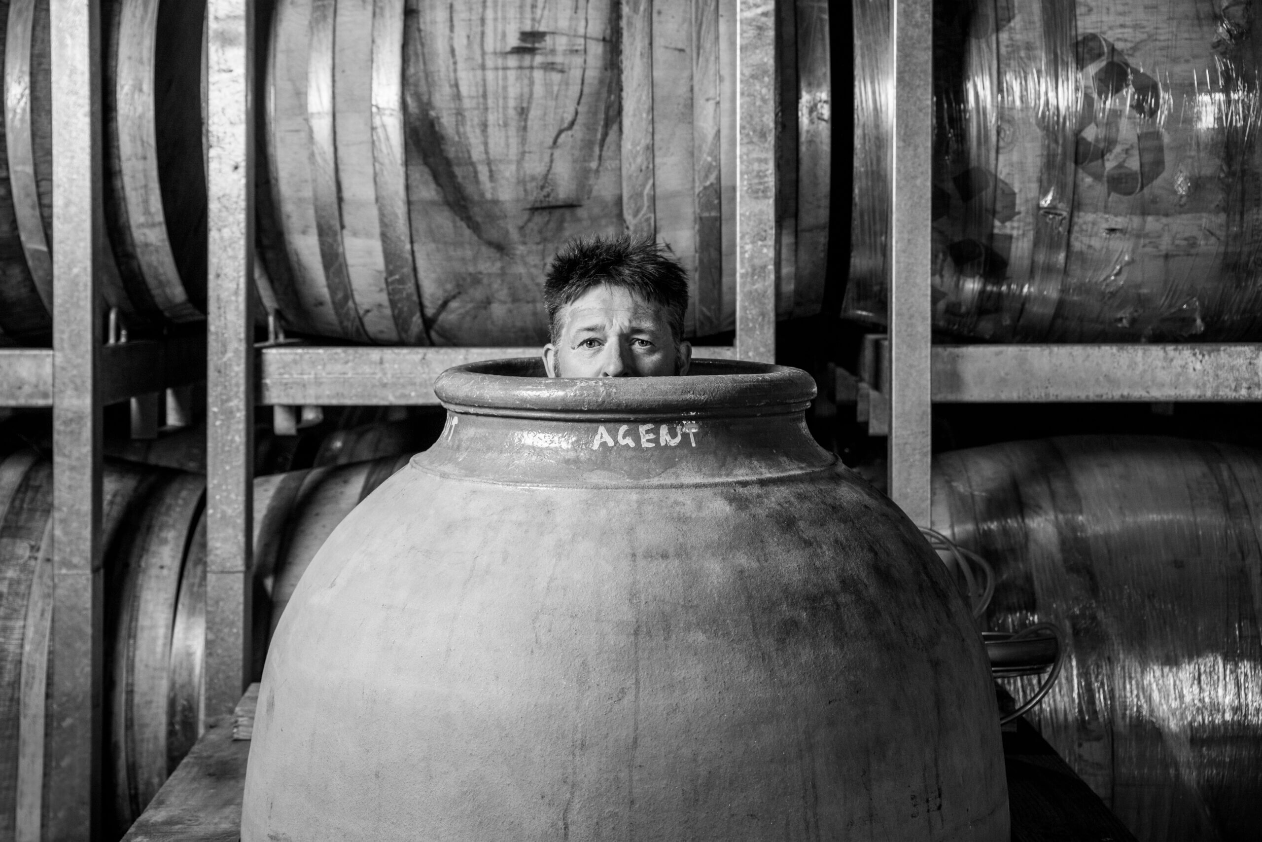 Ben Glover in an amphora, as featured on Wine Blast podcast (Ben, not the amphora)