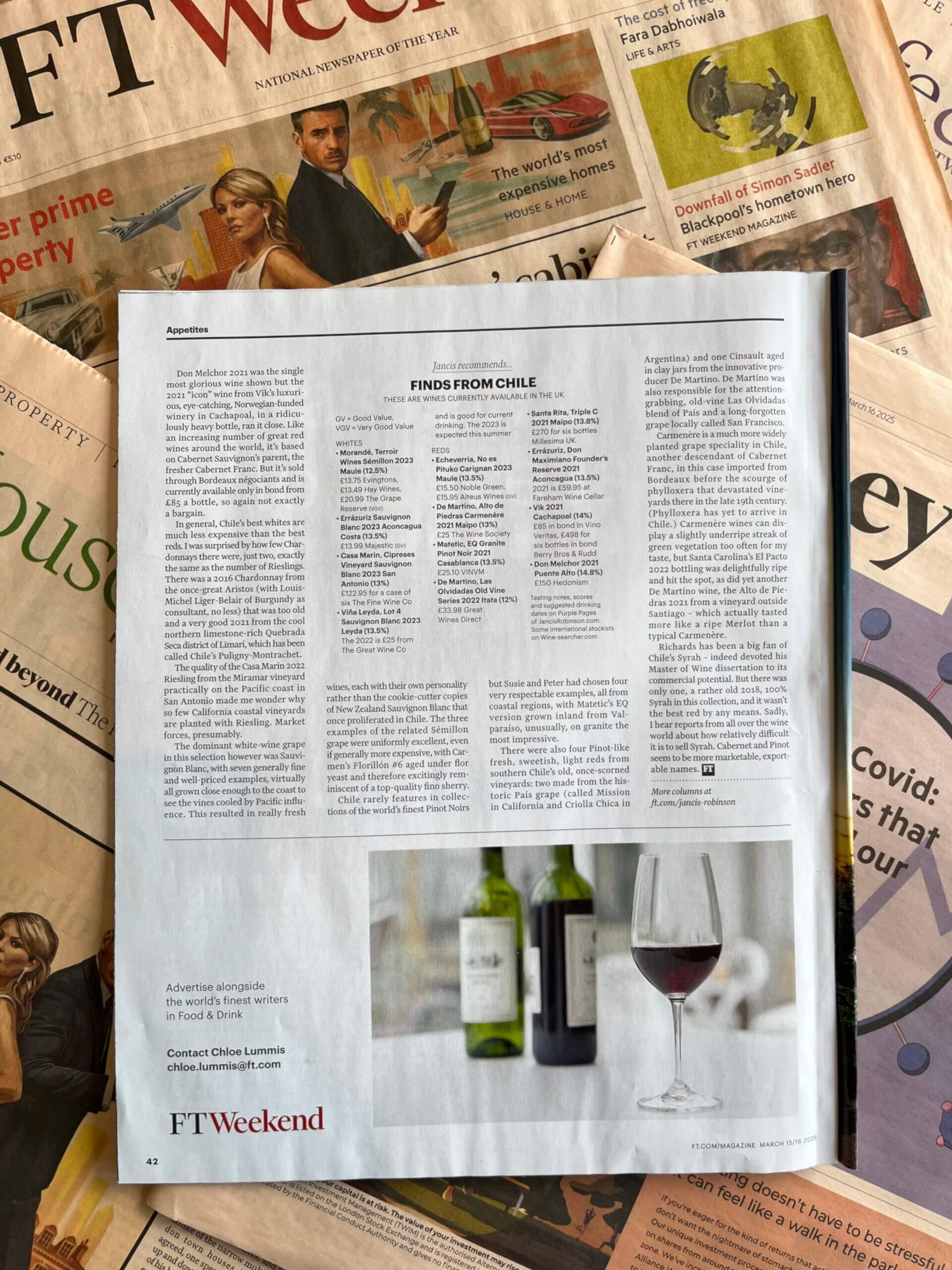 Chile Wines of the Year 2024 coverage by Jancis Robinson in The Financial Times March 2025